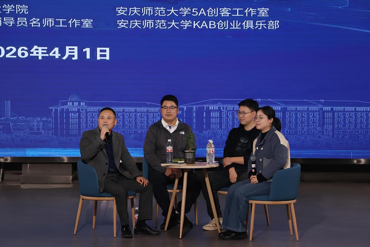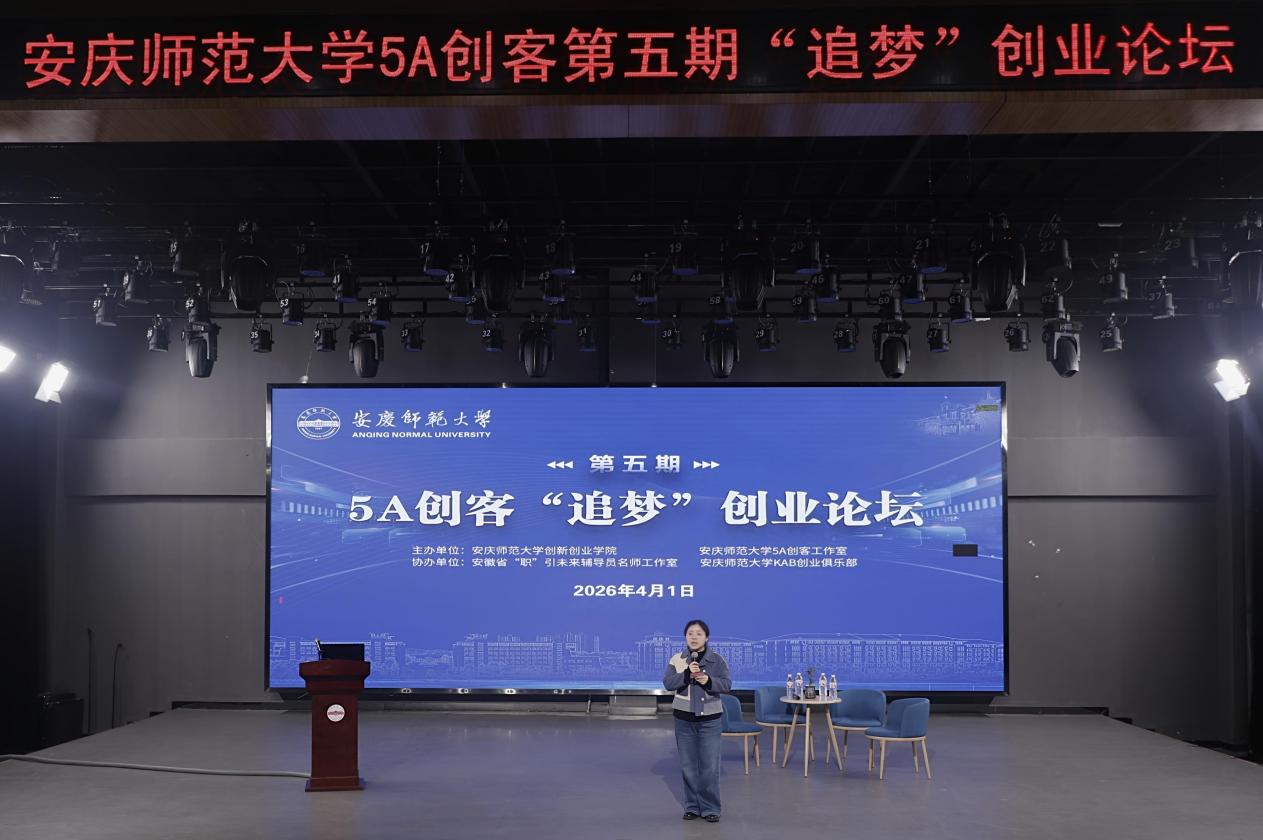 4月1日下午,5A创客“追梦”创业论坛活动在安庆师范大学传媒学院演播厅举行。活动邀请2014届广播电视专业校友、安徽省新时代青年先锋、甘棠乡村originals团队负责人胡亮亮和2018届计算机科学与技术专业校友、上海玛布山科技有限公司技术总监吴伟康担任主讲嘉宾,安徽省创业筑梦导师、学校能源环境与空间信息工程学院党委书记夏斐出席,近百名学生参加。