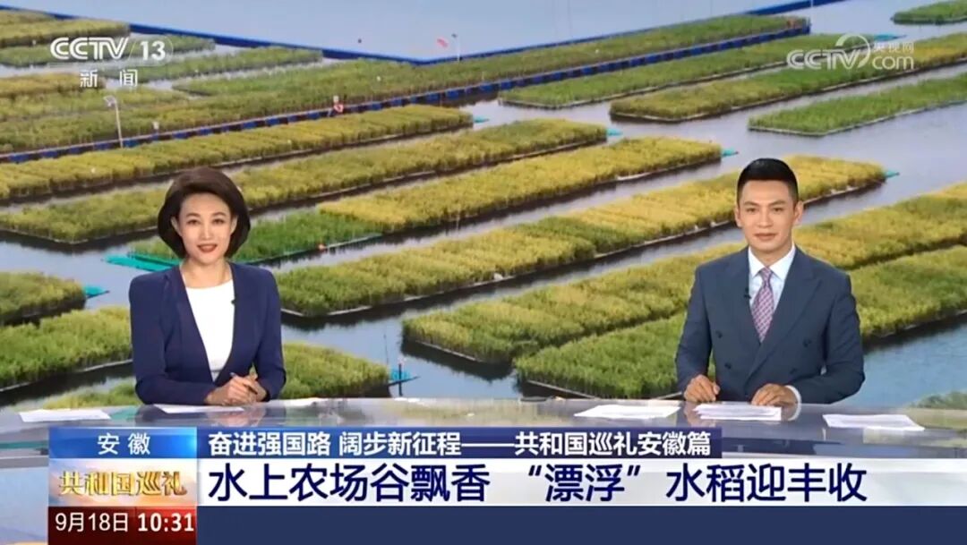 近日,央视新闻频道、央视新闻客户端推出大型直播特别节目《共和国巡礼》,节目以新中国75年发展变化,特别是党的十八大以来各地各项事业取得的历史性成就、发生的历史性变革为主线,展示一个焕发中国式现代化光彩的中国、一个欣欣向荣的中国。在9月18日上午播出的《奋进强国路 阔步新征程——共和国巡礼·安徽篇》中,以《水上农场谷飘香 “漂浮”水稻迎丰收》为主题,用时近五分钟,对淮河能源集团公司“采煤沉陷区水面种稻”科研项目进行现场直播。